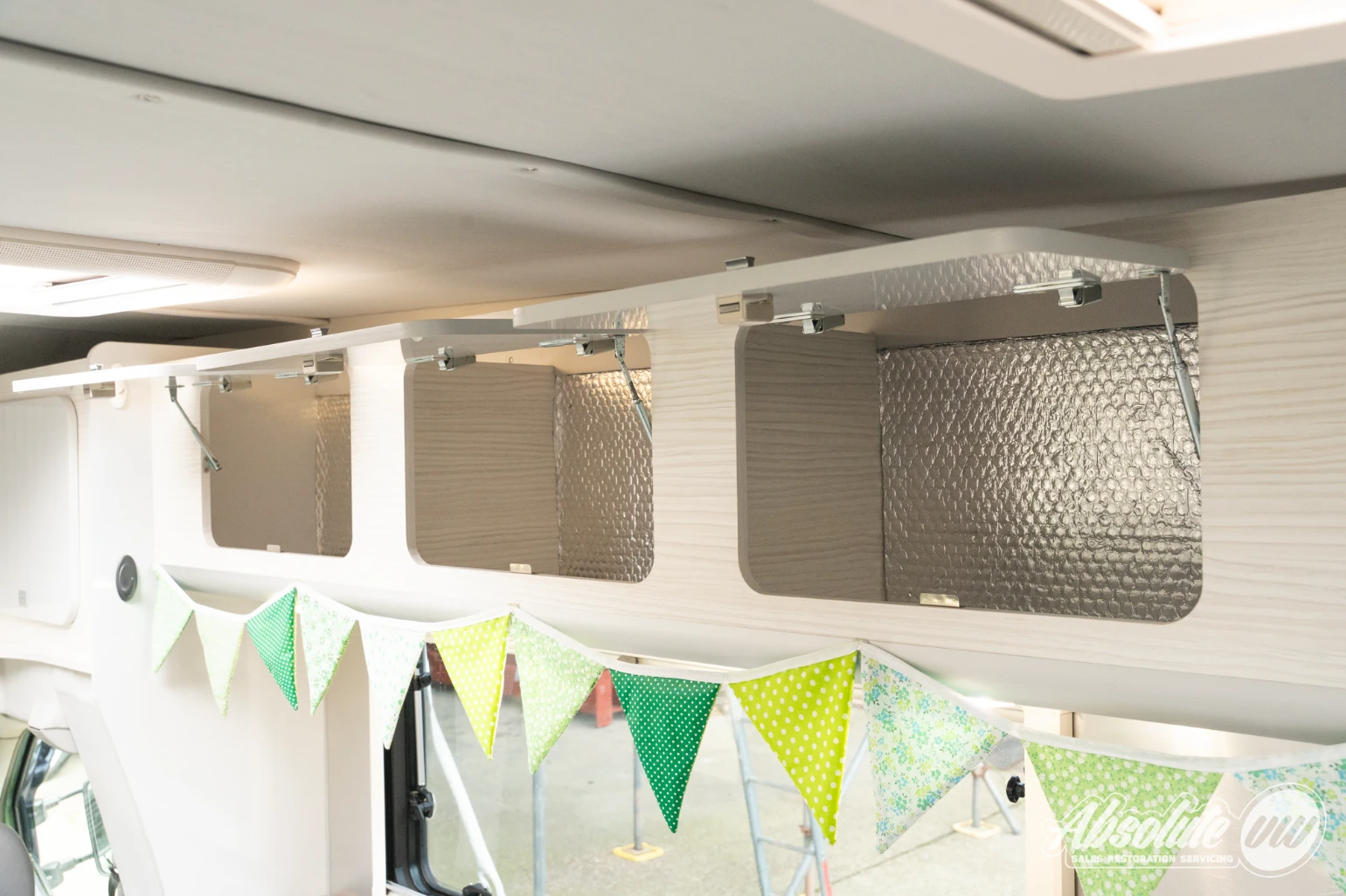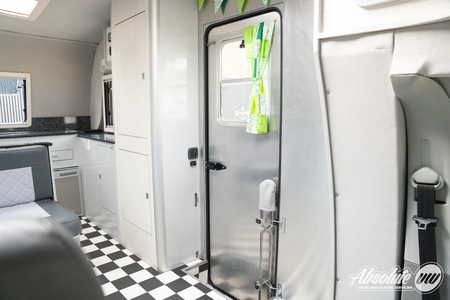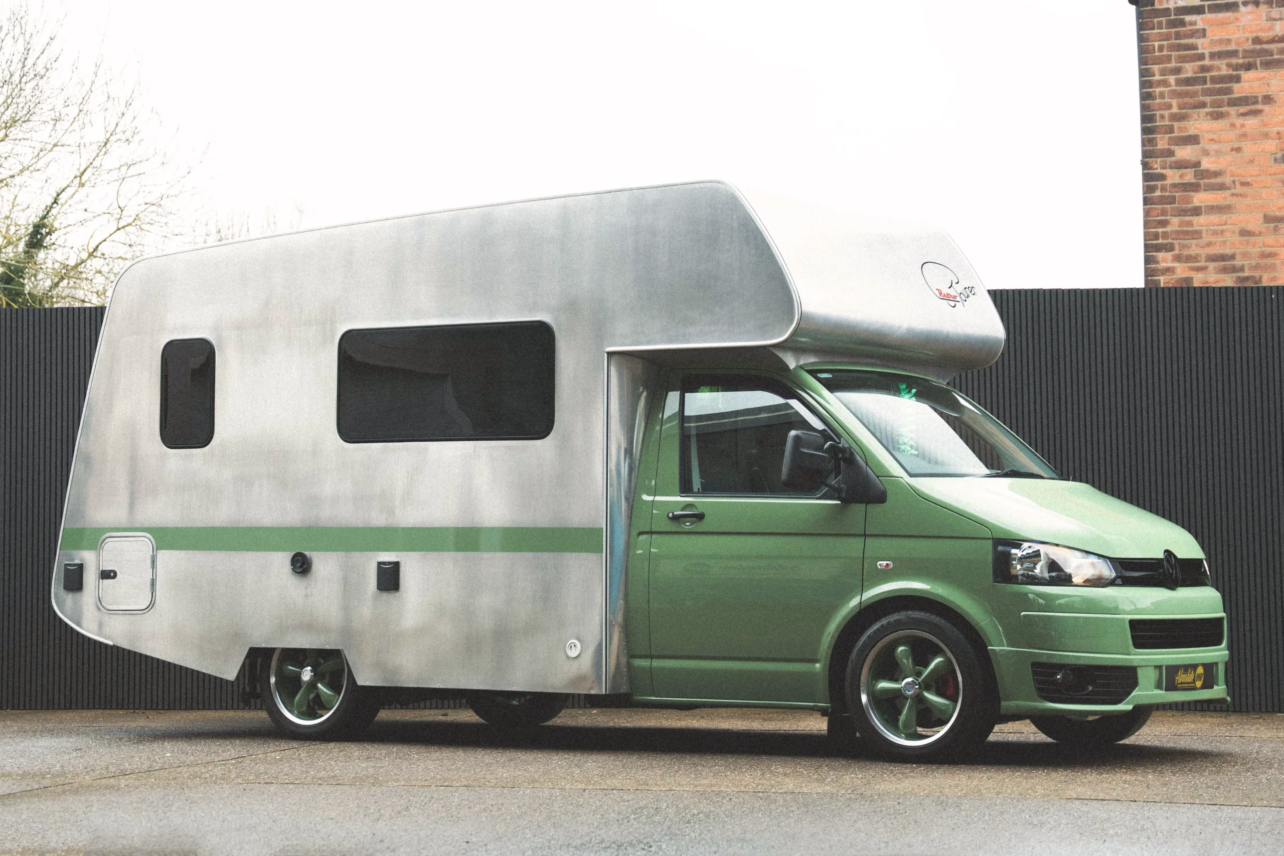 The coachbuilt body itself is constructed from aluminium and exudes classic American styling, inspired by the distinctive rounded Airstream design and the Karmann Gipsy coachbuilds. The Transporters body colour was originally dark grey but has since been resprayed in the green you see today, complemented by colour-coded five-spoke American-style wheels and a side-stripe to create a striking contrast with the aluminium retro body.