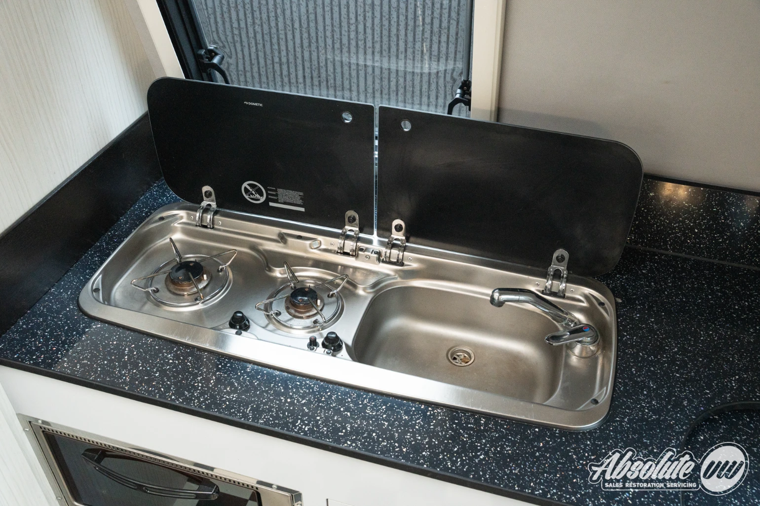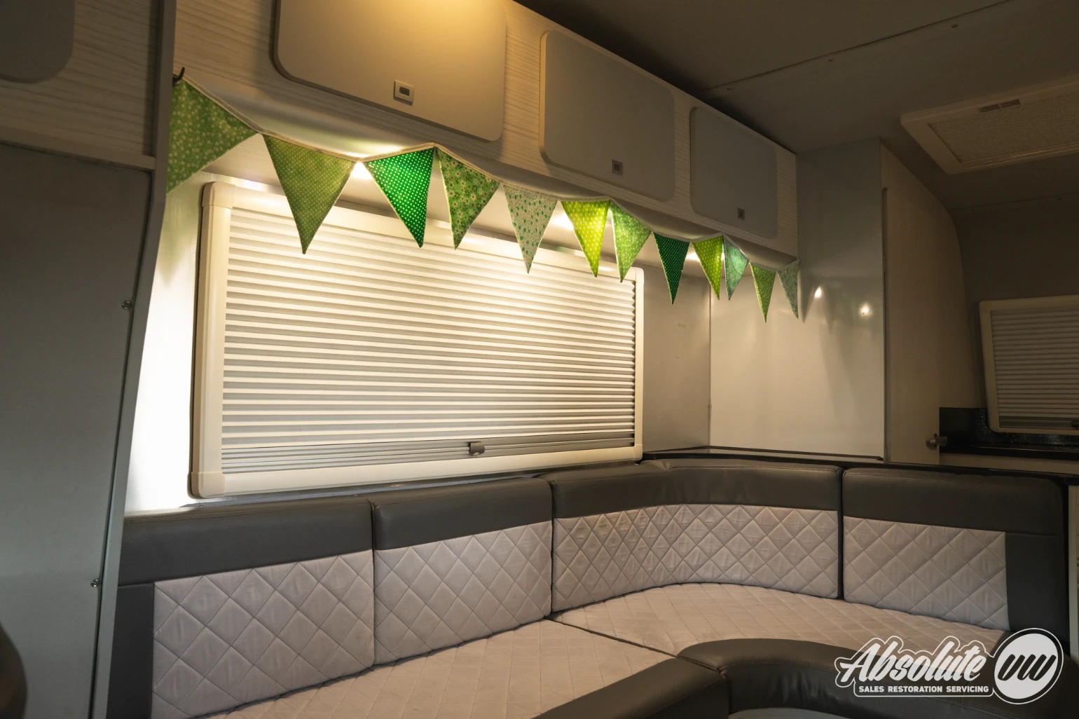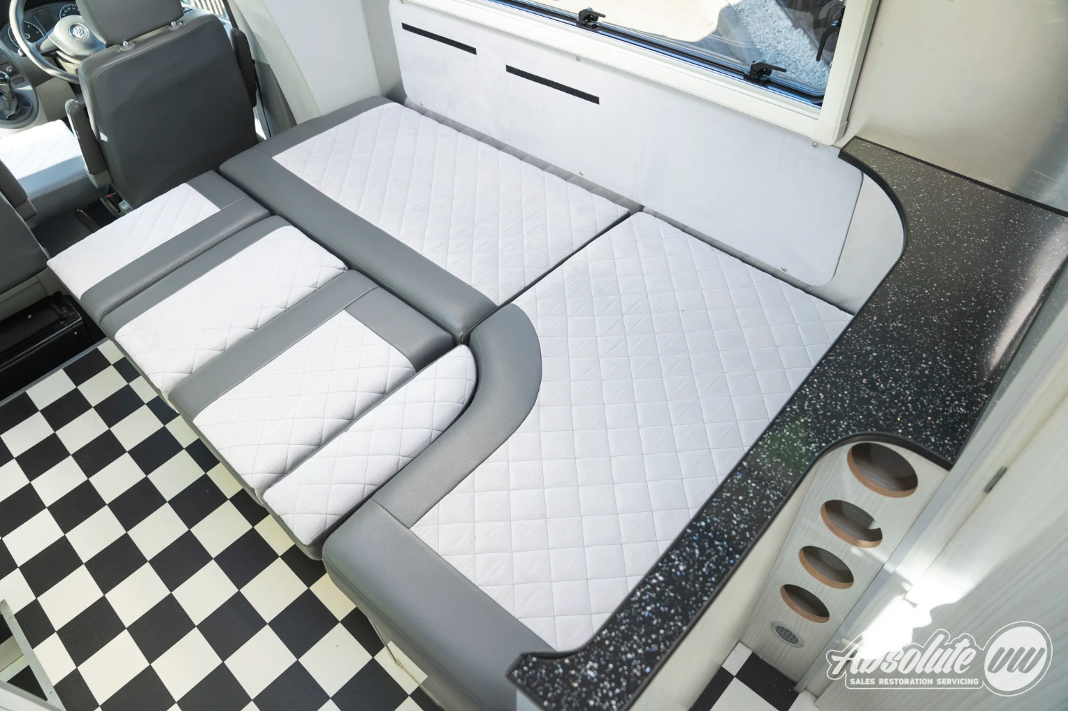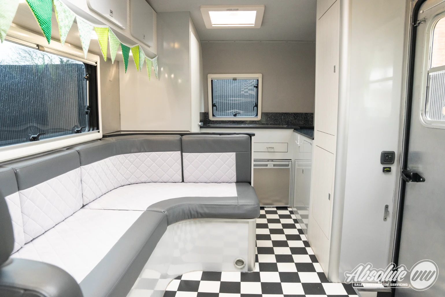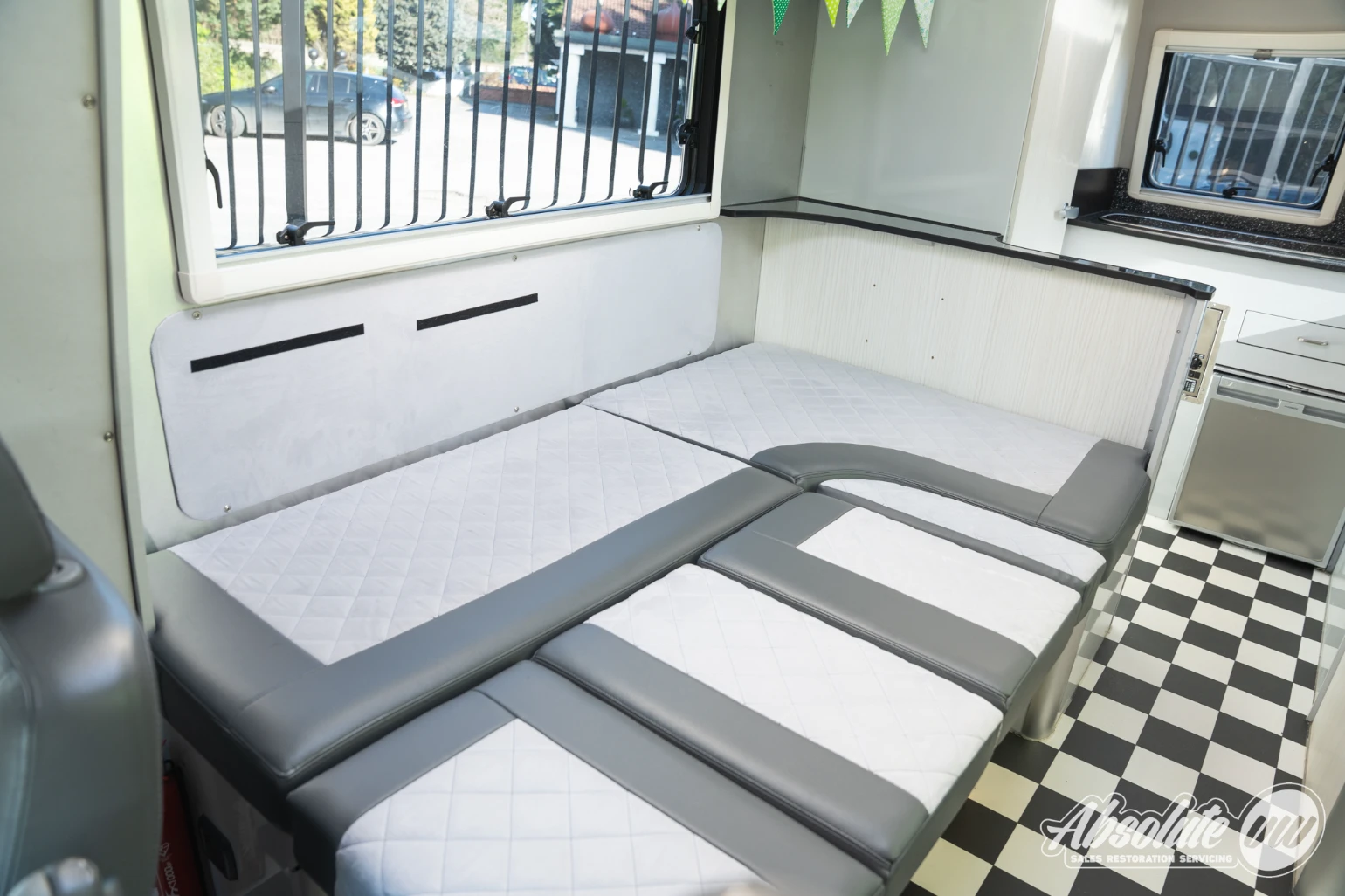 Inside, there is ample living space for two people. The L-shaped bench converts into a bed while still allowing access through to the rear, where you’ll find the kitchen area and a toilet room.