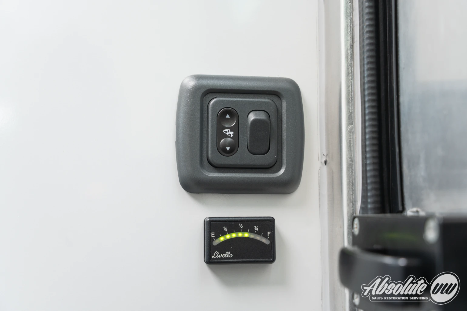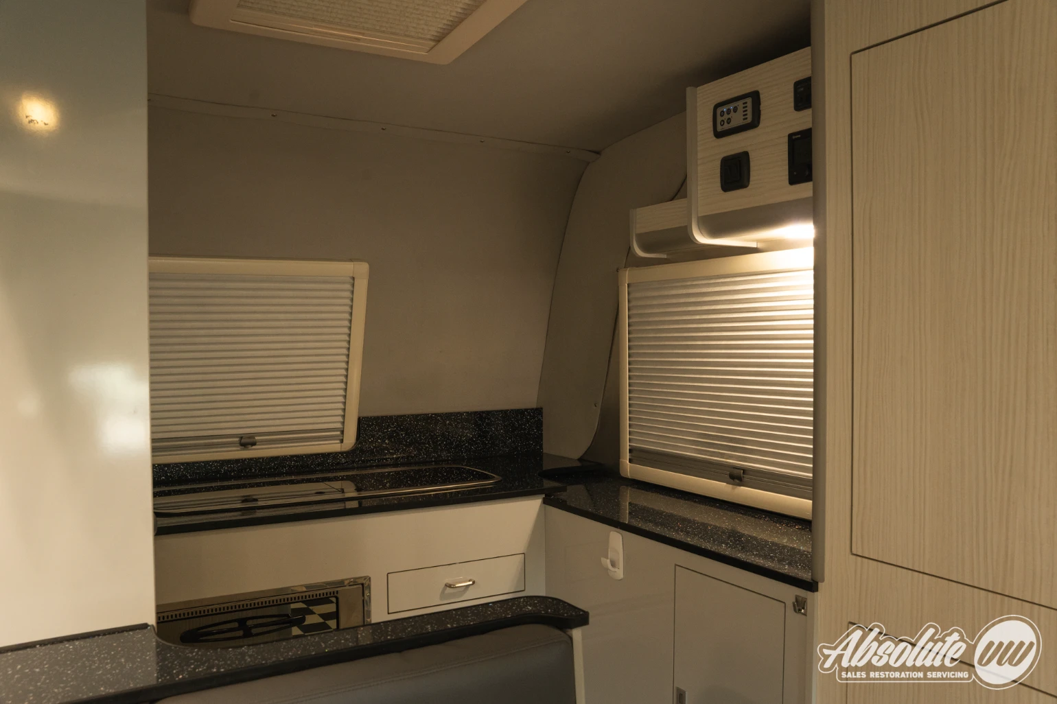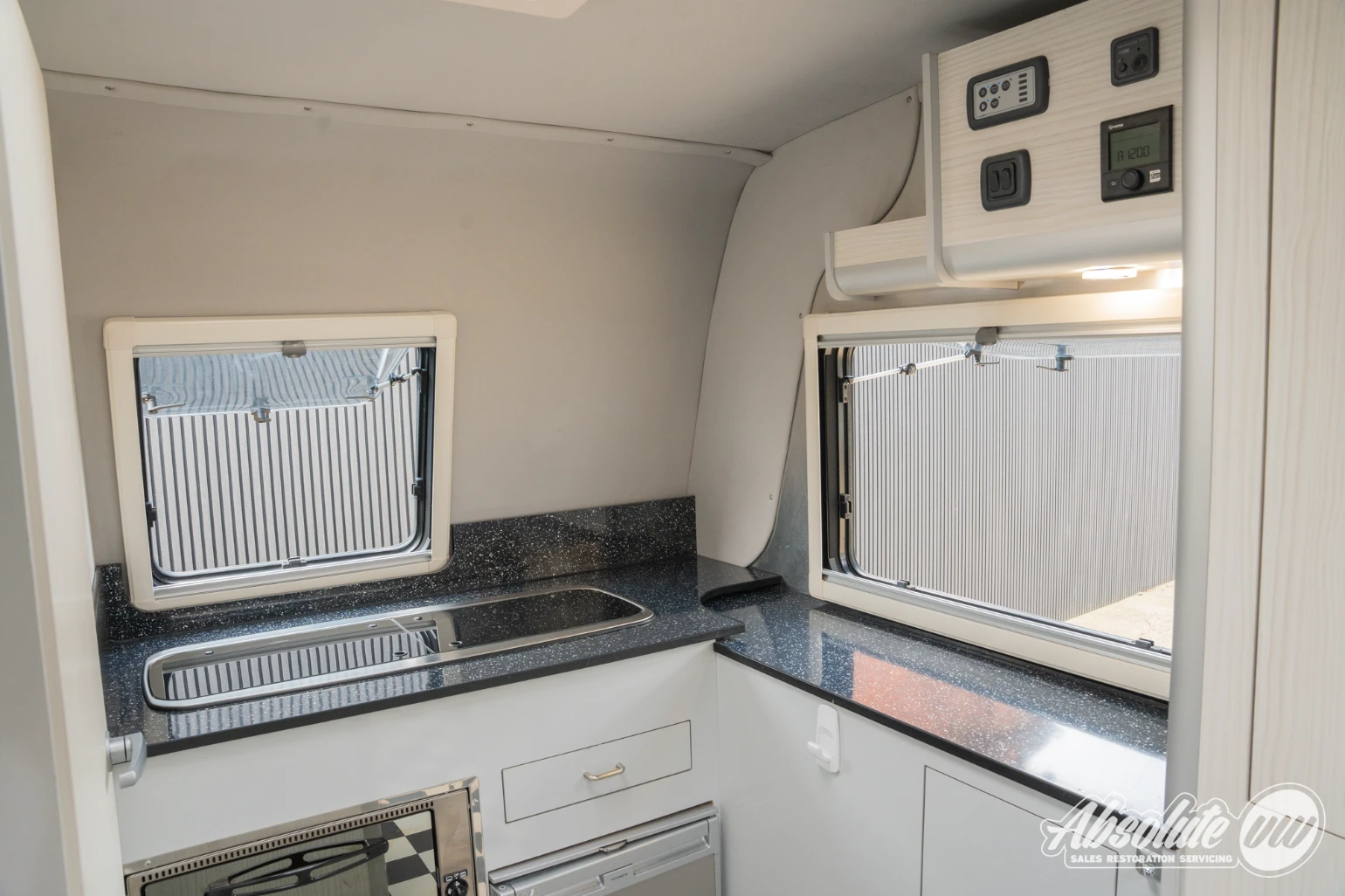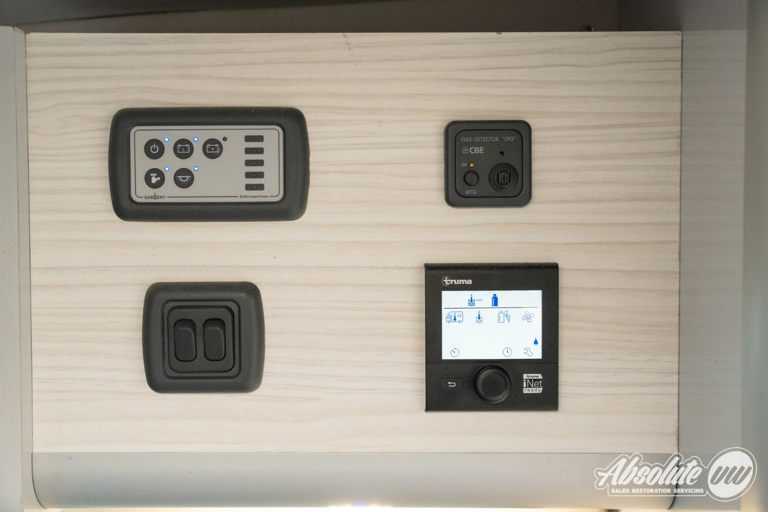 All camping appliances including the interior lighting, built-in boiler, auxiliary heater and plug sockets are controlled via the interfaces above the kitchenette.
