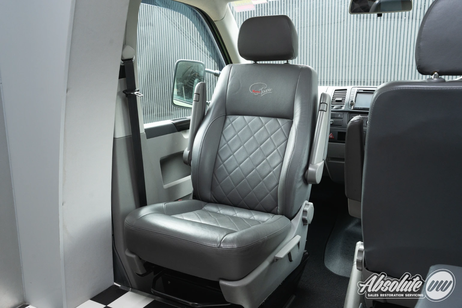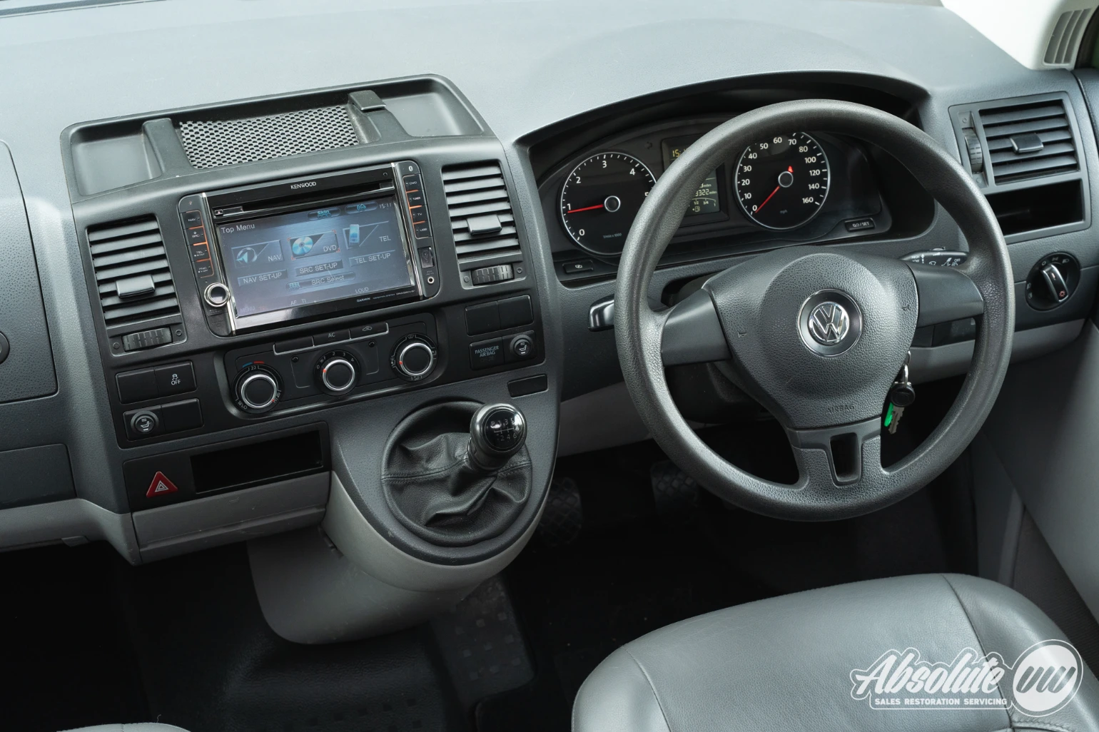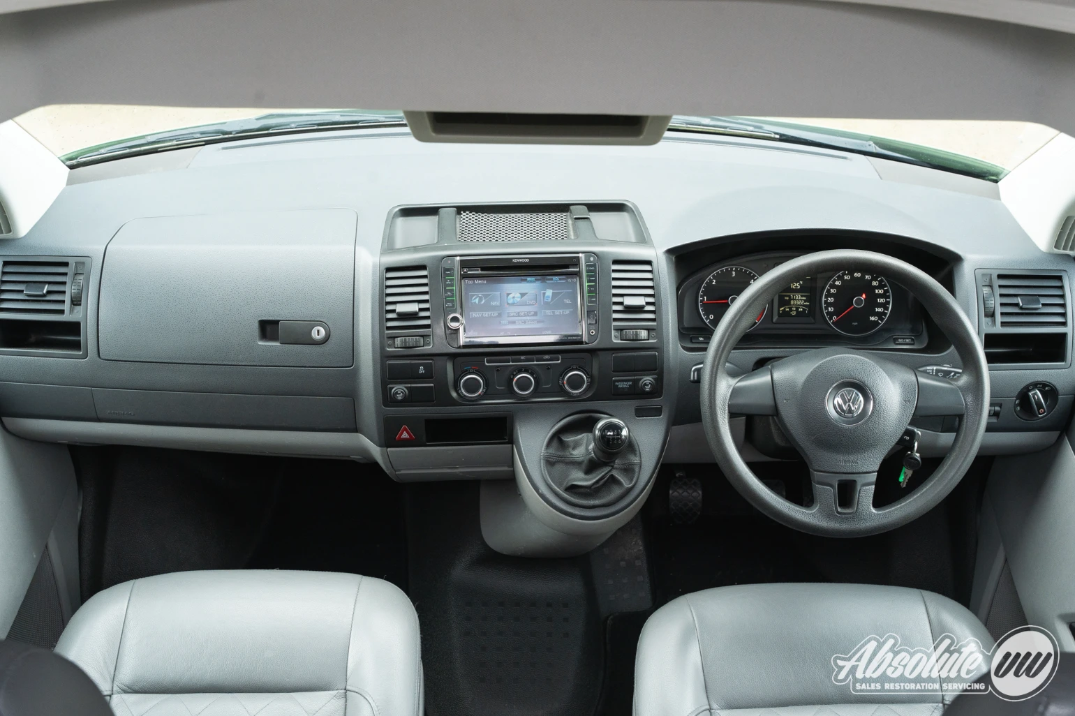 Up front in the cabin, everything remains familiar with the T5.1 Transporter dashboard. A couple of extra retrofitted additions include a Kenwood head unit, along with switches for the heated front seats. Both front captain’s chairs are fitted with swivel bases and this model is equipped with factory air conditioning.