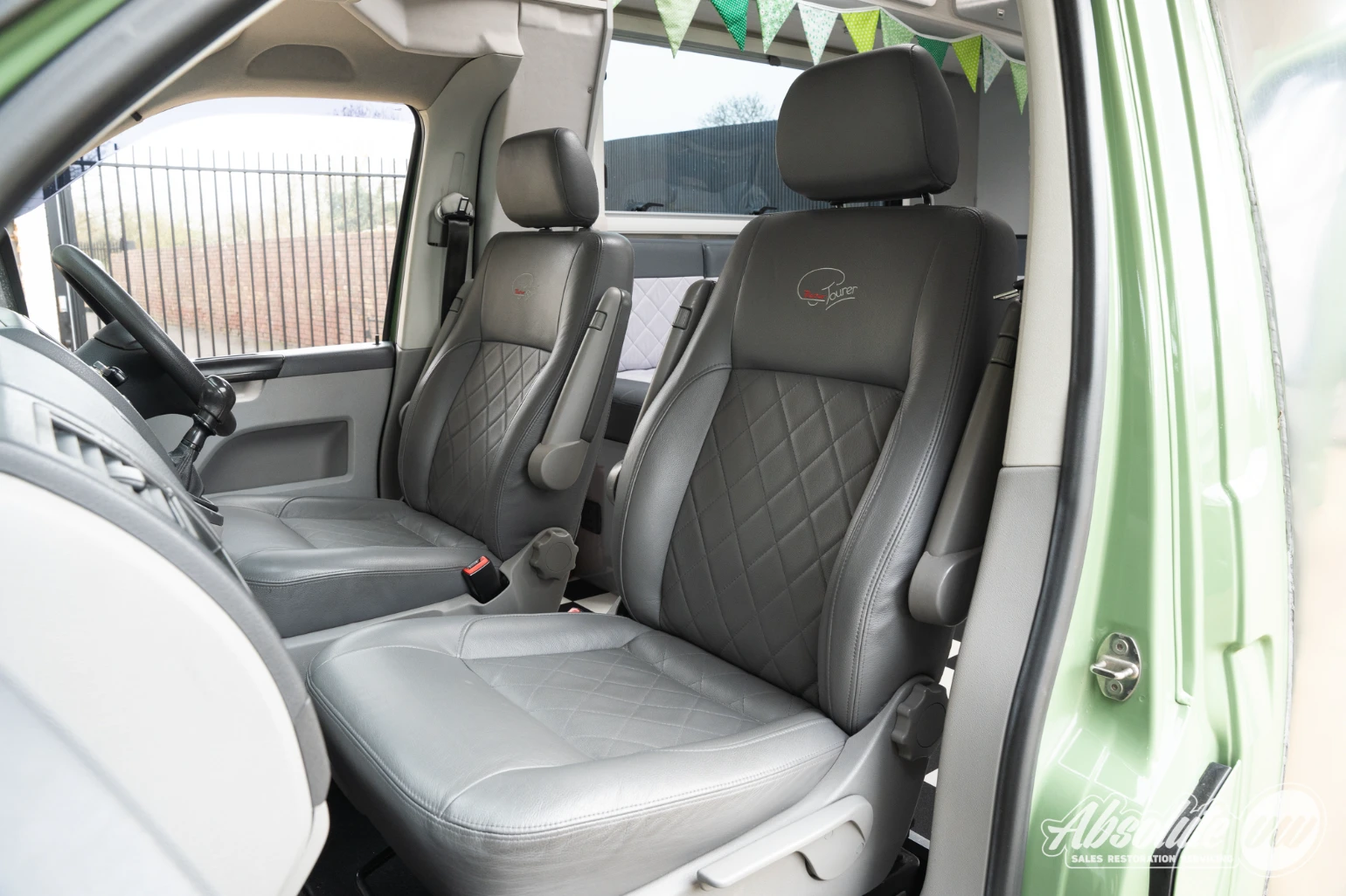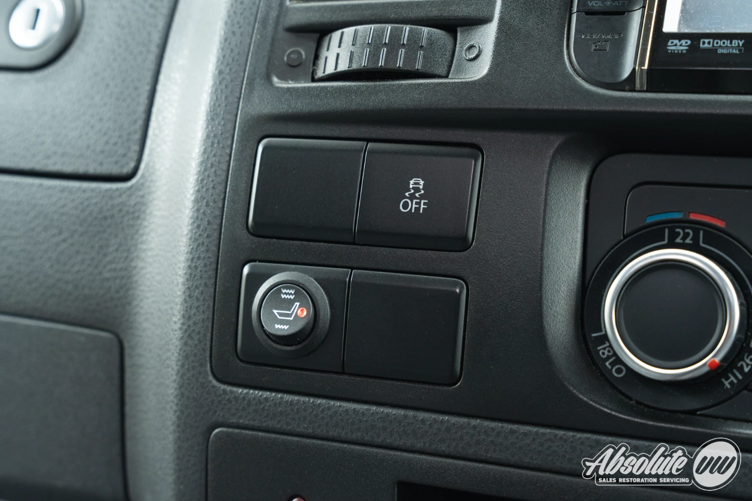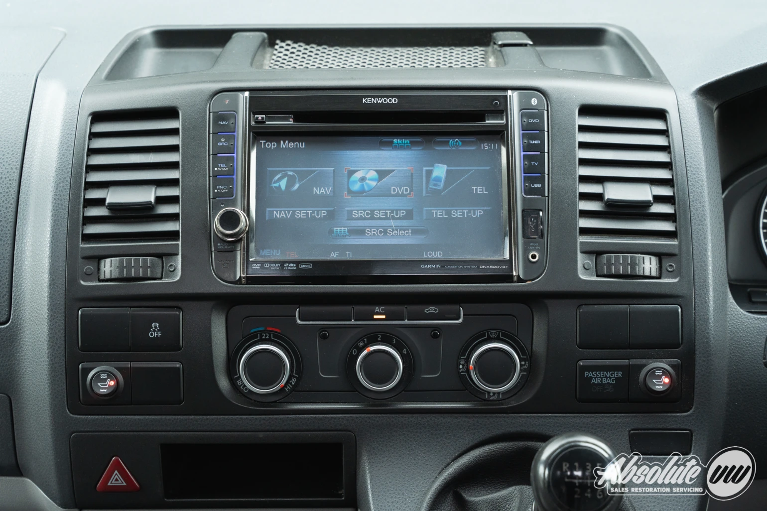 Up front in the cabin, everything remains familiar with the T5.1 Transporter dashboard. A couple of extra retrofitted additions include a Kenwood head unit, along with switches for the heated front seats. Both front captain’s chairs are fitted with swivel bases and this model is equipped with factory air conditioning.