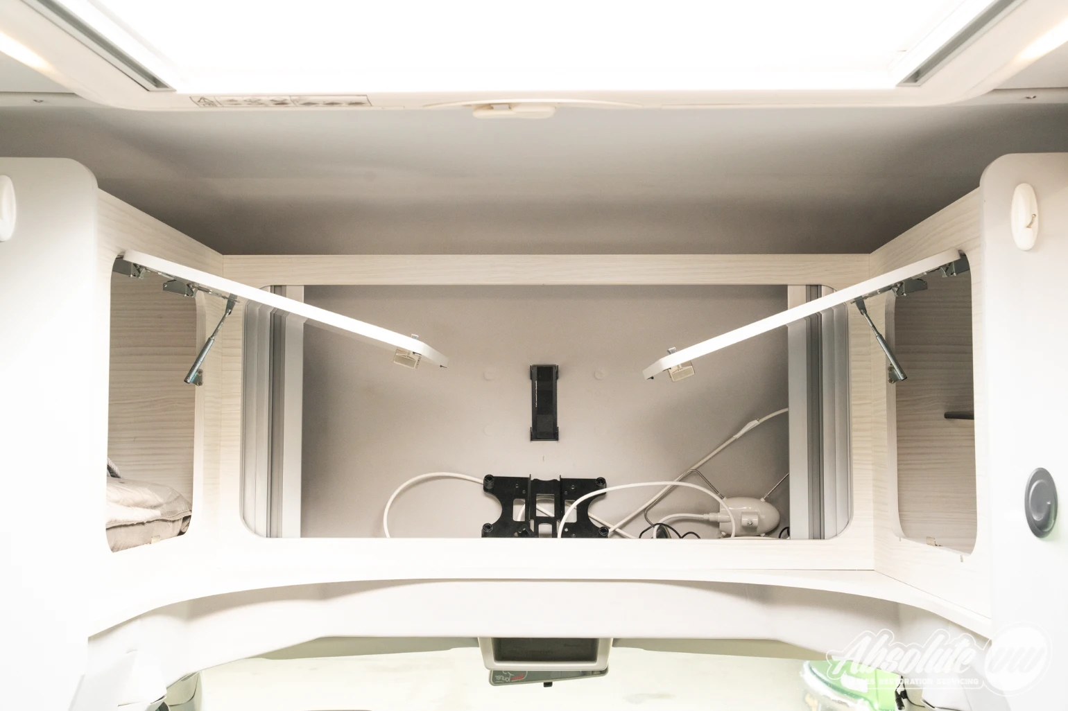 Storage is plentiful throughout with multiple cabinets providing ample space. Above the front seats, a cabinet includes a pre-installed mounting bracket and plug socket allowing for easy installation of a TV.